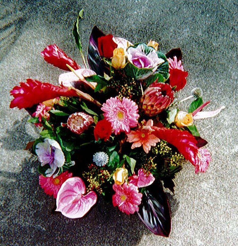 Blue Hydrangea potted in stone urn. White Hydrangea Pink Gerbera Daisy,Hot Pink Tulips, Pale Yellow Roses, Light Pink Stock, Green Bells of Ireland and Exotic Foliage. Our Signature Millennium Roses with Yellow Spider Mums, Hot Pink Roses and Tulips, Multi-colored...